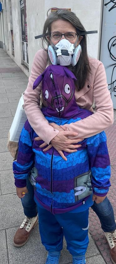 لكي أتمكن من التواجد في الأماكن المغلقة دون أن تتفاقم حالتي الصحية، لا سيما حساسية كيميائية متعددة، أضطر إلى ارتداء قناع واقٍ من الأبخرة. وهذا الأمر ليس مزعجاً للغاية فحسب (كما أنه يخيف الناس)، بل إنه غير صحي أيضاً، لأنك تستنشق جزيئات بلاستيكية نانوية. في هذه الصورة، أظهر مع ابن أخي وحفيدي ديلان.